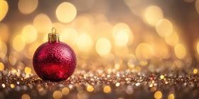 Festive Sparkle: A Shiny Red Christmas Ornament Glistens Amidst a Bed of Glitter and Warm Holiday Lights