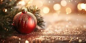Festive Sparkle: A Shiny Red Christmas Ornament Glistens Amidst a Bed of Glitter and Warm Holiday Lights