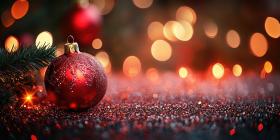 Festive Sparkle: A Shiny Red Christmas Ornament Glistens Amidst a Bed of Glitter and Warm Holiday Lights