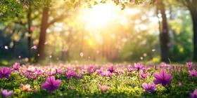 Enchanting Eden: A Path of Blossoms Winds Through a Sun-Drenched Forest, Bathed in Warm Light