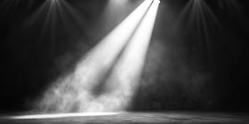 Spotlight on Stage: A Mystical Scene of Blue Smoke Illuminated by a Cluster of Bright Stage Lights