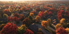 Autumnal Haven: A Serene Neighborhood Bathed in Warm Sunset Hues, with Homes Nestled Amongst Vibrant Fall Foliage and a Tranquil Lake