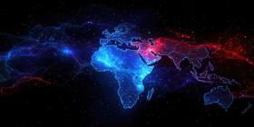 Interconnected World: A Digital Map of the Globe, Illuminated by a Network of Blue and Red Connections