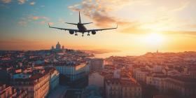 Touchdown in the Twilight: A Plane Descends Over a City Skyline as the Sun Paints the Horizon with Warm Hues