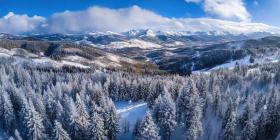 Winter Wonderland: A Breathtaking Panorama of Snow-Dusted Mountains and Evergreen Forests Beneath a Clear Blue Sky
