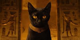 Guardian of the Nile: A Majestic Black Cat, Adorned in Gold, Watches Over the Treasures of Ancient Egypt