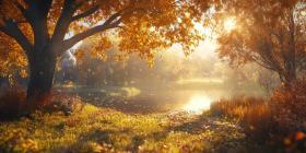 Autumnal Reverie: A Golden Tree Stands Sentinel Beside a Tranquil Pond, Leaves Dancing on the Water's Surface