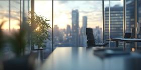 Dawns Reflection: A Modern Office Bathed in the Warm Glow of Sunrise, with a Skyline View Through Expansive Windows