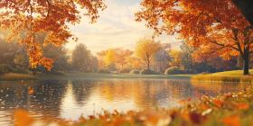 Autumnal Reflections: A Tranquil Pond Reflects the Golden Hues of Fall Foliage, Beneath a Canopy of Crimson Trees