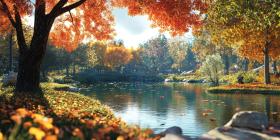 Autumnal Reflections: A Tranquil Pond Reflects the Golden Hues of Fall Foliage, Beneath a Canopy of Crimson Trees