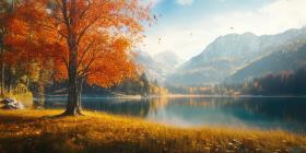 Autumnal Reflections: A Tranquil Pond Reflects the Golden Hues of Fall Foliage, Beneath a Canopy of Crimson Trees