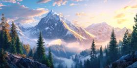 A Majestic Mountain Panorama: Where Dawn Paints the Peaks with Golden Light and Clouds Drift Through Valleys of Evergreen Trees