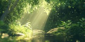 Sunlight Dappled Path: A Tranquil Stream Winds Through a Verdant Forest, Bathed in Warm Sunlight and Dotted with Dancing Butterflies