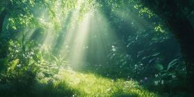 Sunlight Dappled Path: A Tranquil Stream Winds Through a Verdant Forest, Bathed in Warm Sunlight and Dotted with Dancing Butterflies