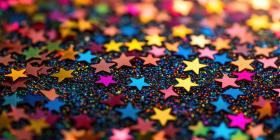 A Celestial Scatter: Multicolored Stars Gleam on a Bed of Shimmering Glitter, Evoking a Sense of Festive Joy