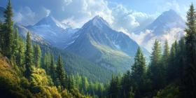 A Majestic Mountain Panorama: Where Dawn Paints the Peaks with Golden Light and Clouds Drift Through Valleys of Evergreen Trees