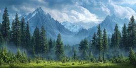 A Majestic Mountain Panorama: Where Dawn Paints the Peaks with Golden Light and Clouds Drift Through Valleys of Evergreen Trees