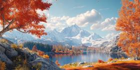 A Symphony of Autumn: Snow-capped Mountains Rise Majestically Above a Verdant Valley, Framed by a Canopy of Vibrant Orange Trees