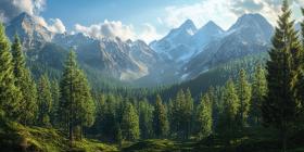A Majestic Mountain Panorama: Where Dawn Paints the Peaks with Golden Light and Clouds Drift Through Valleys of Evergreen Trees