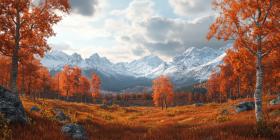 A Symphony of Autumn: Snow-capped Mountains Rise Majestically Above a Verdant Valley, Framed by a Canopy of Vibrant Orange Trees