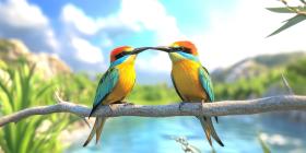 A Love Song in Vivid Hues: Two Rainbow Bee-eaters Perch on a Branch, Beaks Touched in a Tender Display of Affection, Against a Backdrop of Serene Nature