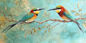 A Love Song in Vivid Hues: Two Rainbow Bee-eaters Perch on a Branch, Beaks Touched in a Tender Display of Affection, Against a Backdrop of Serene Nature