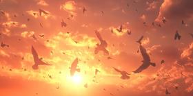 A Sky Filled with Hope: A Flock of Birds Takes Flight Against a Vibrant Sunset, Their Silhouettes Painting a Picture of Freedom and Renewal