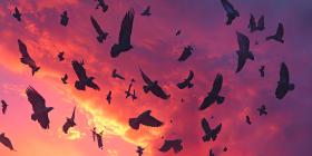 A Sky Filled with Hope: A Flock of Birds Takes Flight Against a Vibrant Sunset, Their Silhouettes Painting a Picture of Freedom and Renewal