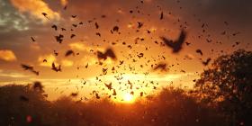 A Sky Filled with Hope: A Flock of Birds Takes Flight Against a Vibrant Sunset, Their Silhouettes Painting a Picture of Freedom and Renewal