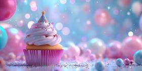 A Sweet Symphony of Celebration: A Whimsical Cupcake Topped with a Party Hat, Nestled Amidst a Cloud of Colorful Balloons and Sprinkles, Invites Joy and Merriment