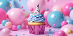 A Sweet Symphony of Celebration: A Whimsical Cupcake Topped with a Party Hat, Nestled Amidst a Cloud of Colorful Balloons and Sprinkles, Invites Joy and Merriment