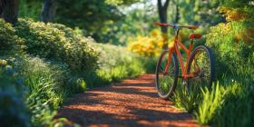 A Sunlit Path Beckons: A Vintage Bicycle Stands Sentinel on a Winding Dirt Road Through a Lush, Flower-Filled Forest, Bathed in Warm Morning Light