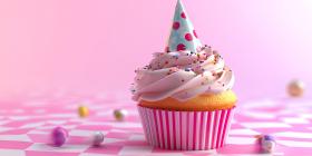 A Sweet Symphony of Celebration: A Whimsical Cupcake Topped with a Party Hat, Nestled Amidst a Cloud of Colorful Balloons and Sprinkles, Invites Joy and Merriment