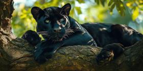 Serene Shadow: A Black Panther, a Phantom of the Jungle, Lounges on a Moss-Covered Branch, Its Presence a Whisper of Untamed Grace