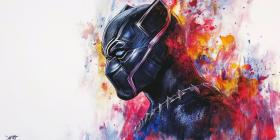The Prowling Shadow: A Black Panther, Rendered in a Dynamic Fusion of Watercolor and Digital Art, Emerges from a Storm of Color, Capturing the Essence of Power and Primal Grace