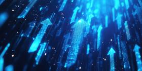 Digital Ascent: A Surge of Blue Arrows, Composed of Data Streams and Binary Code, Symbolize Progress, Innovation, and the Unstoppable Power of Technology