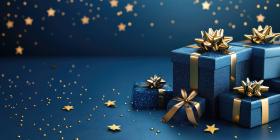 Midnight Magic: A Cluster of Shimmering Blue Gifts, Adorned with Golden Bows and Embellishments, Beckons Amidst a Starry Night, Evoking a Sense of Enchantment and Festive Wonder