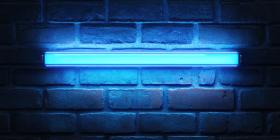 Neon Glow on Brick: A Vibrant Blue Neon Sign, Mounted Against a Rustic Brick Wall, Casts a Luminous Glow, Creating a Striking Contrast of Textures and Tones
