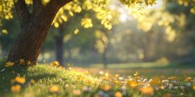 A Sunlit Meadow: Sunlight filters through the leaves of a majestic tree, illuminating a vibrant carpet of wildflowers in a picturesque meadow