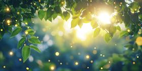 A Midsummer Night Dream: Sunlight filters through a canopy of leaves, illuminating a magical scene where fireflies twinkle like stars against a backdrop of lush greenery