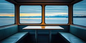 A Window to Tranquility: A vintage-style ferry cabin offers a panoramic view of the serene ocean and distant mountains, inviting a moment of peaceful contemplation