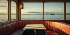 A Window to Tranquility: A vintage-style ferry cabin offers a panoramic view of the serene ocean and distant mountains, inviting a moment of peaceful contemplation