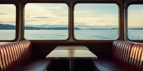 A Window to Tranquility: A vintage-style ferry cabin offers a panoramic view of the serene ocean and distant mountains, inviting a moment of peaceful contemplation