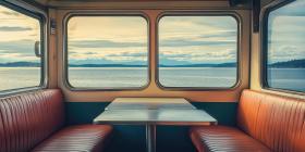 A Window to Tranquility: A vintage-style ferry cabin offers a panoramic view of the serene ocean and distant mountains, inviting a moment of peaceful contemplation