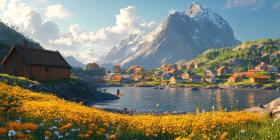 A Tranquil Fjordside Village: Charming wooden houses nestled amidst a vibrant meadow of wildflowers, overlook a serene fjord surrounded by snow-capped mountains and a sky painted with fluffy clouds