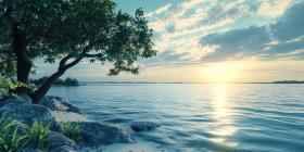 Serene Sunset on the Shore: A lone tree stands sentinel beside a tranquil lake, its silhouette etched against a sky ablaze with golden hues as the sun descends