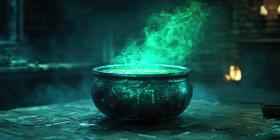 A Cauldron of Secrets: An Ethereal Green Potion Bubbles and Simmers in a Mystical Cauldron, Casting an Enchanting Glow in a Dark and Atmospheric Setting