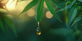 A Dewdrop of Natures Gift: A glistening water droplet hangs delicately from a vibrant cannabis leaf, capturing the essence of life and renewal in this potent plant
