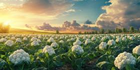 A Field of Ivory: A vast expanse of cauliflower heads, glistening under a dramatic sunset sky, forms a mesmerizing landscape of nature's bounty