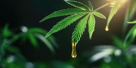 A Dewdrop of Natures Gift: A glistening water droplet hangs delicately from a vibrant cannabis leaf, capturing the essence of life and renewal in this potent plant